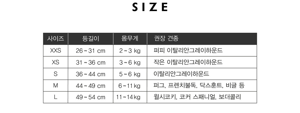 사이즈를 선택할 때 평균 몸무게보다는 등길이를 최우선으로 사이즈 선택하시기 바랍니다.