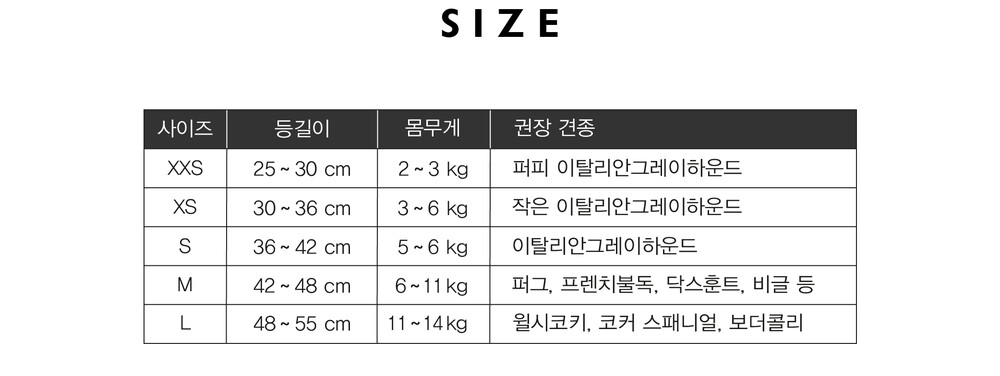 사이즈를 선택할 때 평균 몸무게보다는 등길이를 최우선으로 사이즈 선택하시기 바랍니다.