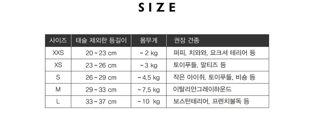 사이즈를 선택할 때 평균 몸무게보다는 등길이를 최우선으로 사이즈 선택하시기 바랍니다.