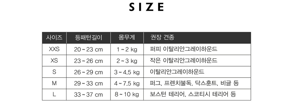 사이즈를 선택할 때 평균 몸무게보다는 등길이를 최우선으로 사이즈 선택하시기 바랍니다.